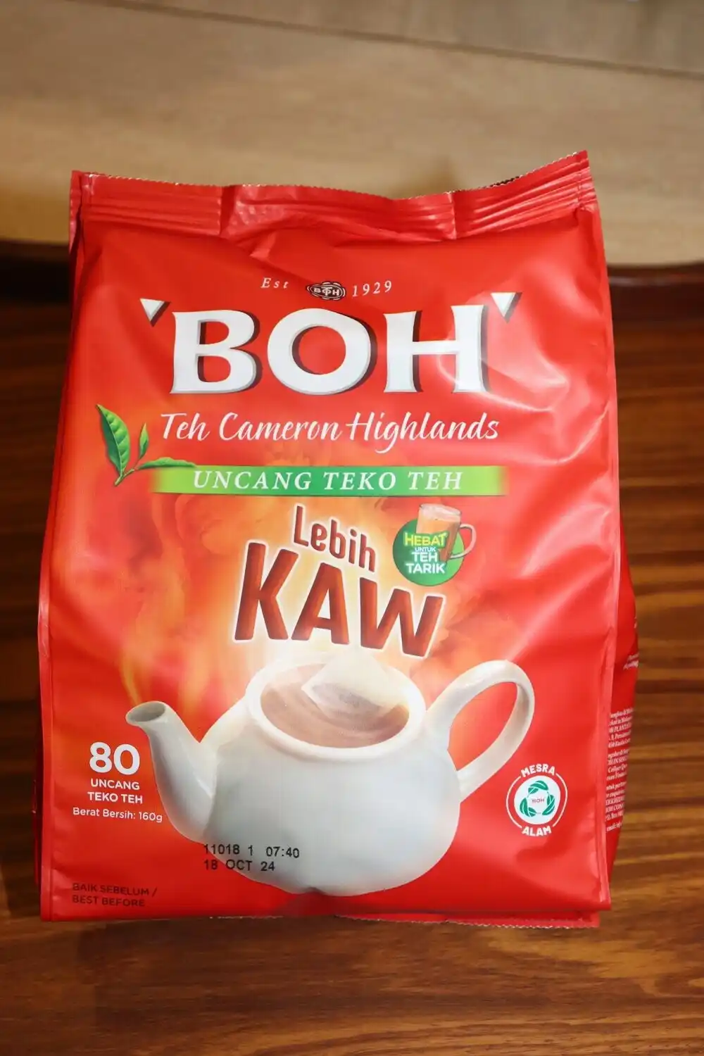 Teh Boh berasal dari perkebunan teh tertua di Malaysia yang terletak di daerah dataran tinggi Cameron. Teh Boh merupakan salah satu teh favorit orang Malaysia dan sering disajikan sebagai teh tarik, minuman khas yang sangat populer. Anda bisa menemukan Boh Tea dalam berbagai varian, termasuk Boh Tea Original, Boh Tea Lime, dan Boh Tea dengan rasa lemon atau jahe. Teh ini cocok untuk oleh-oleh, terutama bagi pecinta teh, dan sering dijual dalam kemasan menarik untuk menambah kesan elegan.