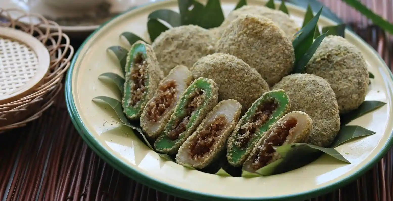 Tepung Gomak adalah camilan tradisional yang terbuat dari tepung ketan dan dibalut dengan parutan kelapa. Bentuknya bulat kecil, dengan isian gula merah atau kacang hijau yang manis. Tepung Gomak sering kali disebut sebagai “onde-onde Melayu” karena kemiripan bentuknya dengan onde-onde.